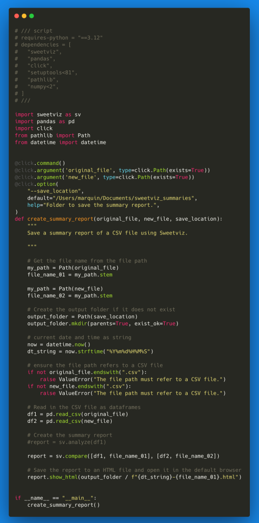 The below code shows a python script that will generate the report comparing 2 csv files with sweetviz.