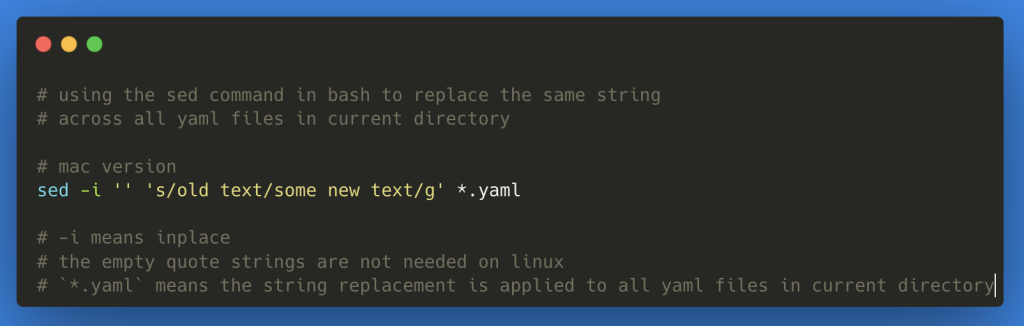 sed -i '' 's/old text/some new text/g' *.yaml